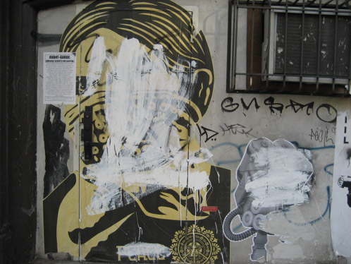 Since late autumn 2006, around the time of the final, great explosion of street art at 11 Spring St. in Nolita, in downtown New York City, we started to notice that a lot of work by some well-known street artists was suddenly being defaced with splashes of paint. Works by Swoon, Shepard Fairey, Faile and many others were attacked with bright colors of paint that appeared to have been intentionally splashed on to the work. The paint never covered the pieces completely — the underlying art was always identifiable. The mysterious person(s) defacing the art was dubbed “The Splasher.” The atttacks continued through the winter and spring months that followed. Only recently have we noticed that “The Splasher” has slowed down. New York Magazine chronicles and investigates the mystery in a recent article. The irony of the Splasher’s attacks is that they amount to a form of vandalism upon vandalism itself. Most street art is destruction of property in the eyes of the law. The paint splashes can also, as some have pointed out, be construed as an act of art in and of itself, as a crude, shocking commentary upon the street art it targets.