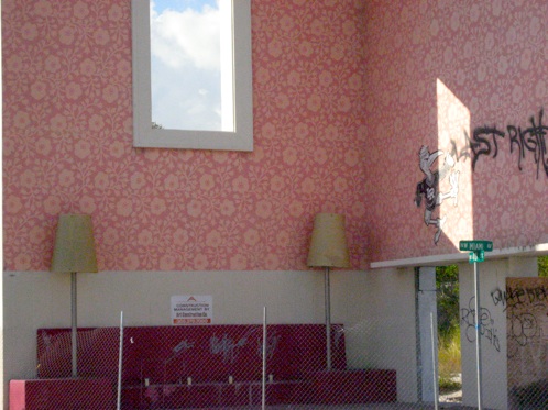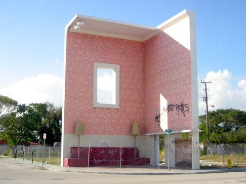 Miami street art: In this case, the art is not so much street art as architectural-art object in the form of an actual building. “The Living Room” is a 2001 art work by Roberto Behar and Rosario Marquardt at the corner of 40th Street and North Miami Boulevard in the Miami Design District. The work is a giant-sized cut-away of a living room interior, with sofa, lamps, and a picture-frame window.