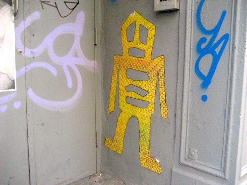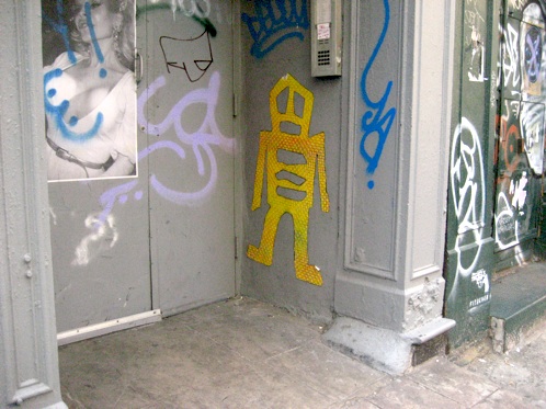 Street art by the ubiquitous Stickman. His stuff is everywhere in downtown New York City. We’ve never been a fan of Stickman, but we’ve always admired that he’s so prolific. That said, we certainly like the direction he’s been going with some recent work. Pictured here is a large paste-up on Crosby Street in SoHo. This is probably the largest Stickman piece we’ve ever seen. We like.