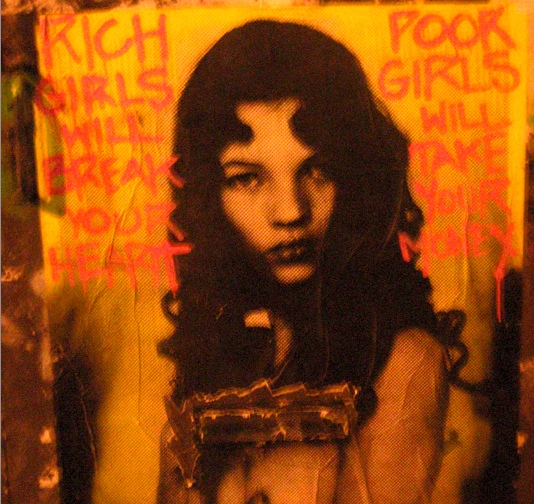 Recent wheat-paste street art by Haculla on Lafayette St. in SoHo / Nolita in downtown New York City. We love the phrases pasted on the image of model Kate Moss: “Rich girls will break your heart” and “Poor girls will take your money.”Beautiful stuff.