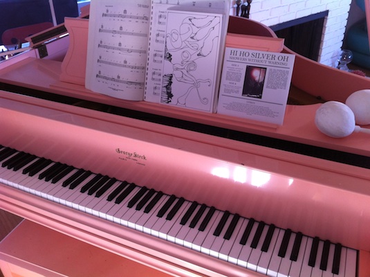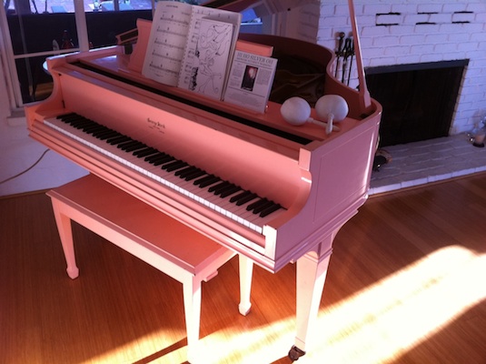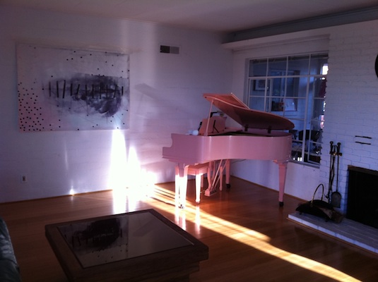 The awesome pink piano belonging to singer/songwriter Leslie Stevens, front-person of the L.A. alt-country band Leslie Stevens and the Badgers. The piano sits in the living room of a hilltop house and studio near Silver Lake, in Los Angeles, and has been played by a list of accomplished musicians, including Jack White of the White Stripes. The art work on the wall in the last photo below is by L.A.-based artist Elizabeth Valdez, with whom Stevens shares the sprawling creative compound.