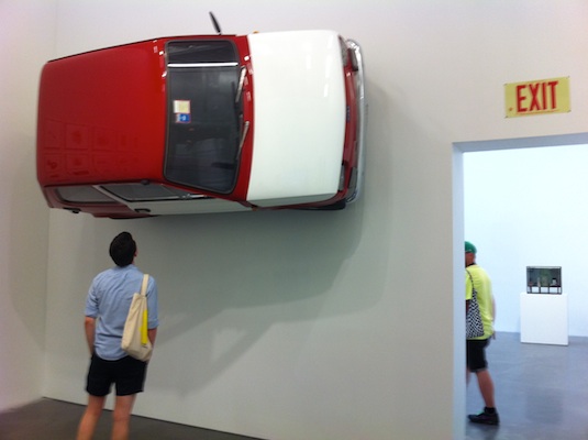 The color-blocked Fiat by British conceptual artist Simon Starling, mounted on a wall at the New Museum in downtown New York City.