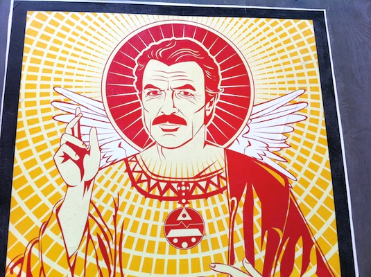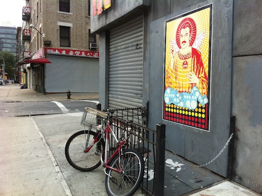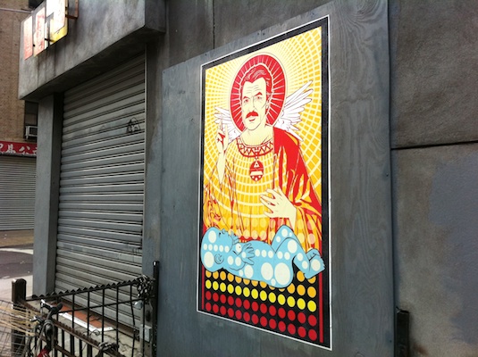 Another installment by artist Dimitri Drjuchin of his “Tom Selleck Saved My Baby” series of wheat-paste street art posters, featuring the moustached face of television and film actor Tom Selleck. Drjuchin’s poster can be found on the exterior wall of the pizza restaurant Lasso at the corner of Kenmare and Mott streets in Nolita, in downtown New York City.