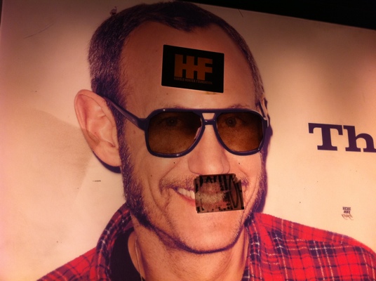 Celebrated fashion and celebrity photographer Terry Richardson appears in a billboard ad for eyewear designer Sol Moscot modeling “The Terry” sunglasses and standing with his signature thumbs-up pose. The ad Is prominently displayed on a backlit billboard outside the Sol Moscot store at the corner of Delancey and Orchard streets in the Lower East Side of New York City. The ad was recently defaced with stickers and graffiti.