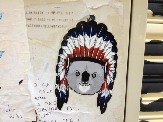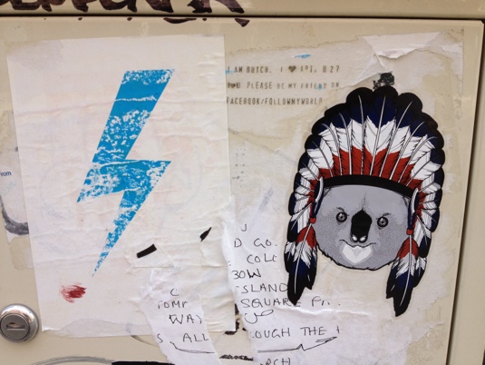 Koala in Native American Headress + Blue Lightning Bolt GG EditorsJune 24, 2012December 14, 2023Street Art Post navigation PreviousNext Share this: Click to share on X (Opens in new window) X Click to share on Facebook (Opens in new window) Facebook Like Loading... Related