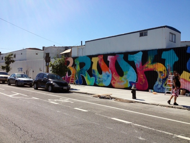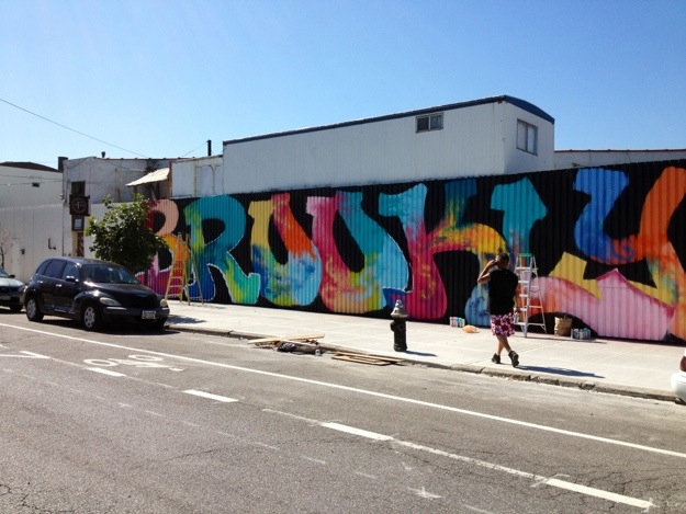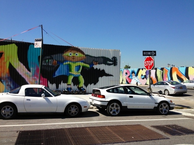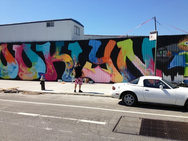 We caught artist Atom Rodriguez working on another of his many massive graffiti-art murals that dominate the buildings around the Kent Street industrial area near the waterfront between Williamsburg and Greenpoint, in Brooklyn. This one aptly enough is called “Brooklyn” and was still a work in progress when we ran into Atom early Thursday morning.