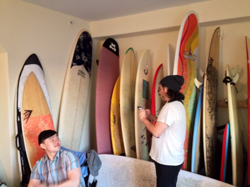 We spent part of our weekend surfing (and checking out a lot of art and drinking a lot espresso, too, of course) at New York City’s Far Rockaway Beach. Some friends invited us too an après-surf Korean BBQ B-day party at a condo across from the beach, where a group of people have rented the condo exclusively for the purposes of storing their surfboards so they don’t have to schlep them from Manhattan and Brooklyn. The living room has been turned into essentially a very large and comfortable closet to keep a quiver of some twenty boards. Clever. Love it.