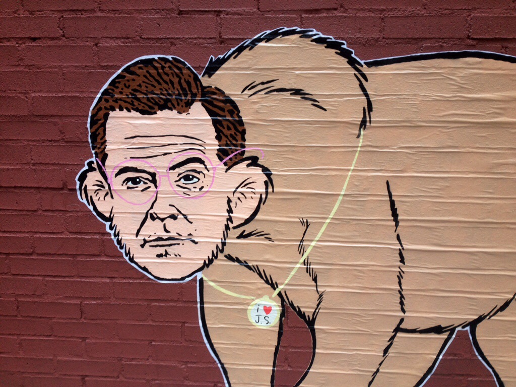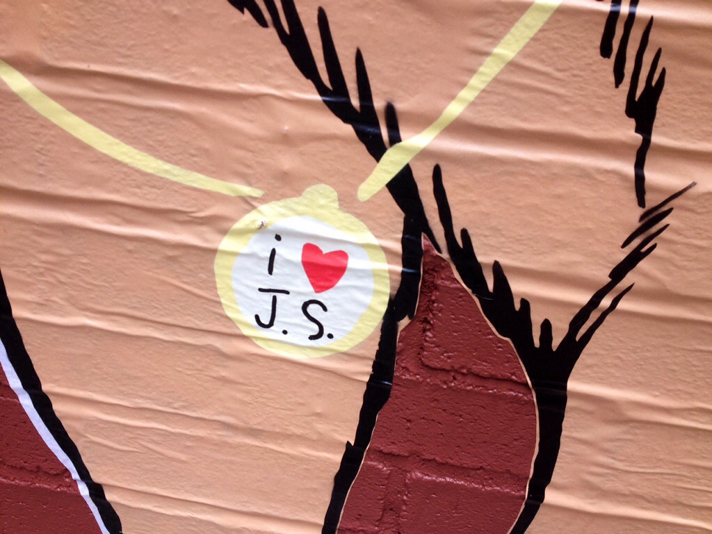 In this case, the “Col-Bear” is a play on the pronunciation of Colbert. (It’s also apt insofar as Colbert’s on-screen persona is famous for hating bears.) The Col-Bear is sporting a necklace with an “I Heart JS” inscription, which is a reference to Jon Stewart. We caught sight of the Col-Bear Thursday afternoon on while running an errand (our project offices are nearby), and wondered if Colbert would mention Hanksy’s work on this show. Sure enough, he did.