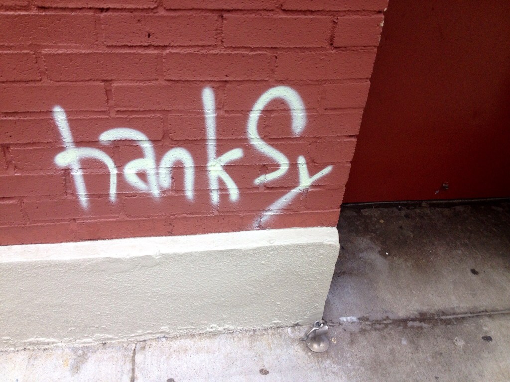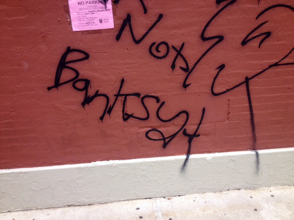 Nearby, on the same, wall somebody has spray-painted “Sorry I’m not Banksy.” (See below.)