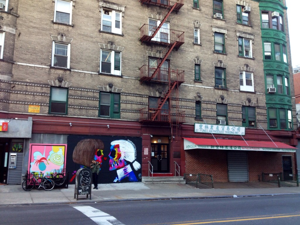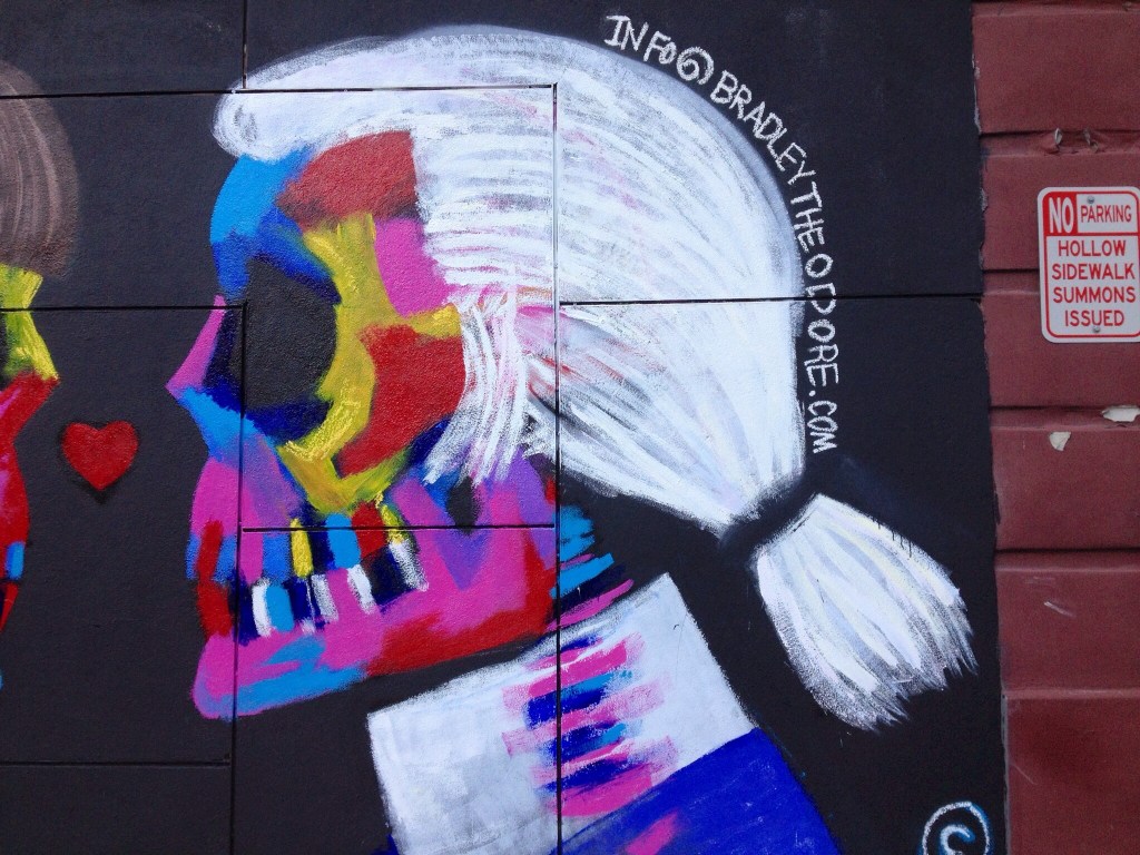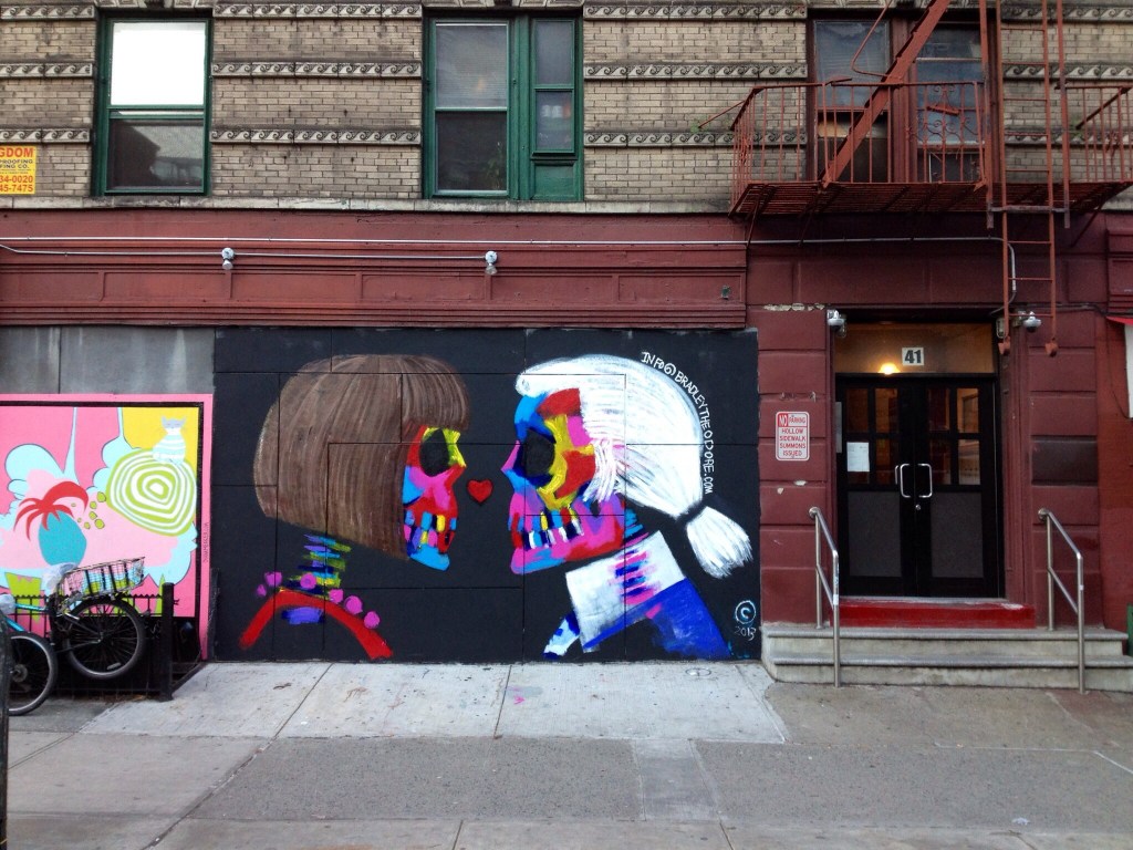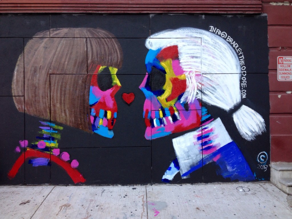 This new street art mural by artist Bradley Theodore just went up last week on the commissioned wall space at L’Asso in New York’s Lower East Side. The images show the colorful profiles of a skull-faced Vogue magazine editor Anna Wintour literally facing off at legendary Chanel and Fendi fashion designer-photographer Karl Lagerfeld (she with the iconic bob haircut, he of the iconic white hair and ponytail). A heart symbol appears in the space between them. The images are simultaneously grotesque and playful.