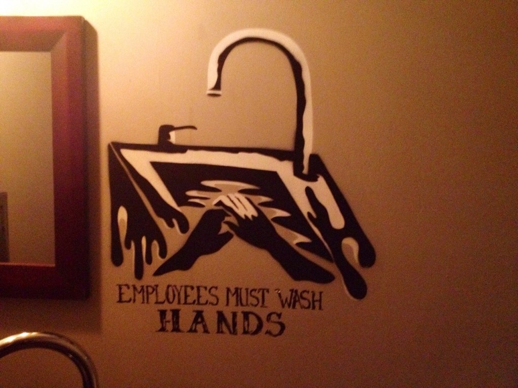 After an awesome day of surfing at San Onofre Beach, a legendary surf spot in Southern California, we went out for beers and grub at the Cellar, a bar in neighboring San Clemente where we were pleasantly surprised to see this stencil street art by the Los Angeles-based street artist Bandit in the bar’s restroom. The town of San Clemente itself is a beautiful beach town that is virtually devoid of graffiti and street art.