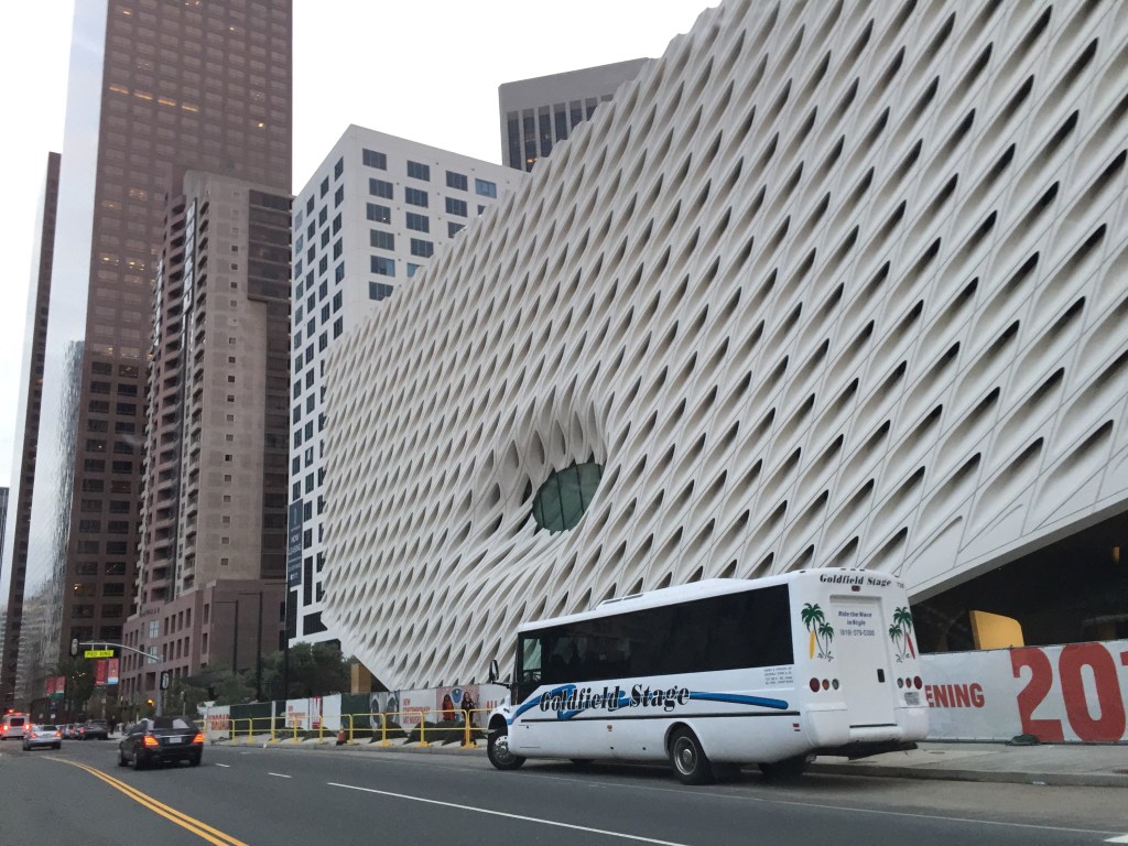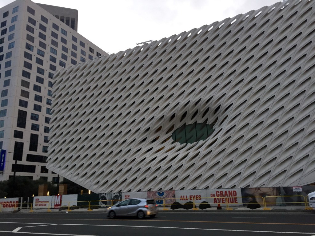 The edgy contemporary architecture of the newly constructed Broad Museum building, a new contemporary art museum in Downtown Los Angeles. The building was designed by the architecture firm Diller Scofidio + Renfro. The museum will open in September 2015.