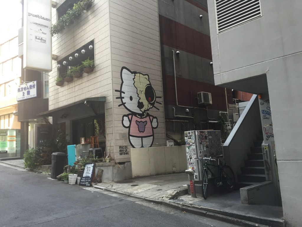 American street artist DFace artwork often works with iconic pop-cultural imagery, often American retro-comic book styles and skeletal graphics. Here in Tokyo he’s de-constructed a Japanese icon, “Kitty -chan,” better know around the world as “Hello Kitty,” revealing her skull.