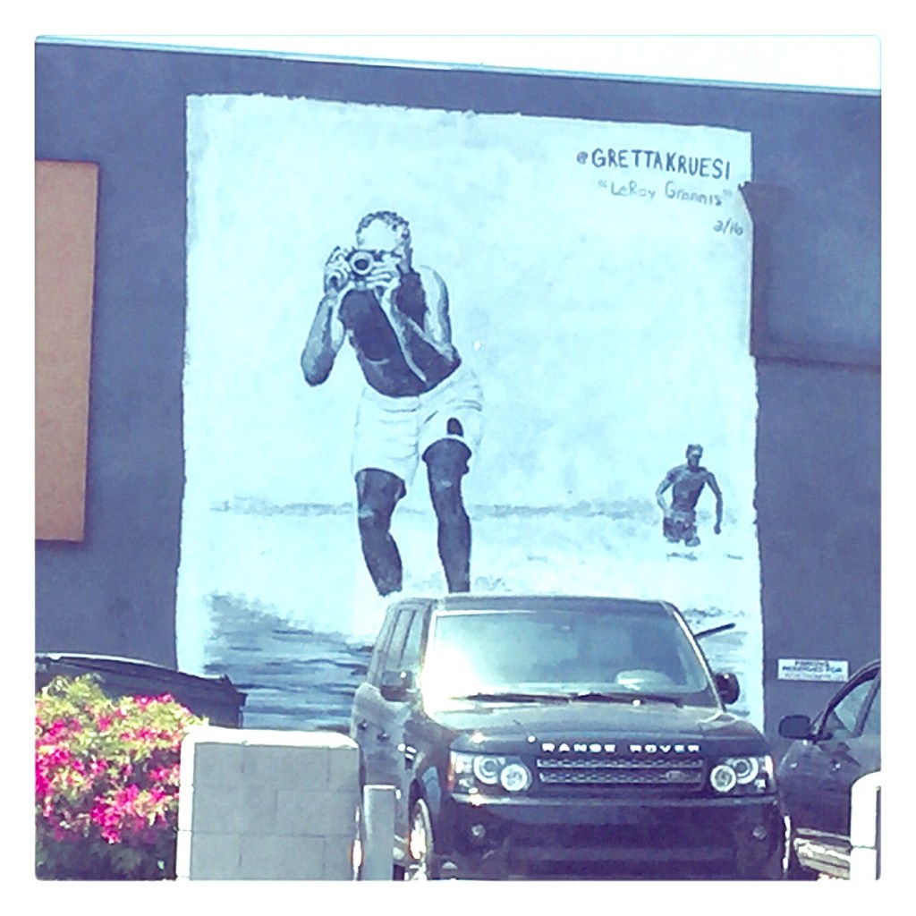 We’re fans of the photography of Leroy Grannis (we even have Taschen’s wonderful book on him) so it’s great to see this awesome mural by artist Gretta Kruesi based on a photo of Grannis himself in Venice, Los Angeles.
