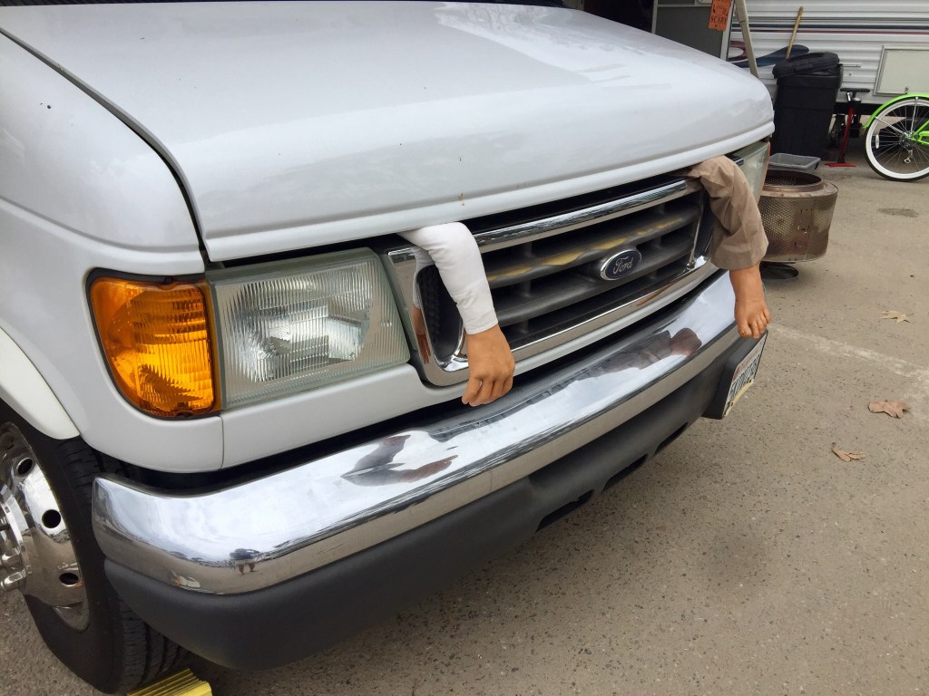 Some campers at the Carpinteria Beach campground near Santa Barbara, California decked out their camper with some funny, inventive Halloween decorations, including some fake human limbs sticking out from under the hood of the RV, suggesting a dead body poorly hidden inside.