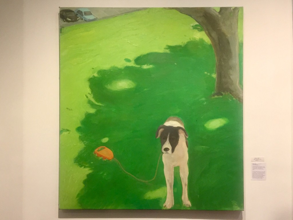 The image begs a lot of questions and invites speculation on many possible narratives, which make this painting so interesting and rewarding. Why is the dog on a leash but nobody is holding his leash? Why is the dog standing there? What is the dog looking at? Are they at a park? Is this in Hawaii? Where is the dog’s owner? Did something happen to his owner? Should I get a pet? What is the meaning of life? And so on.