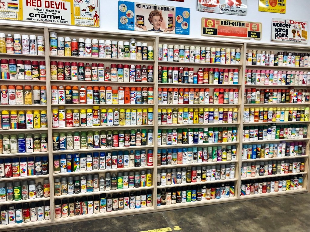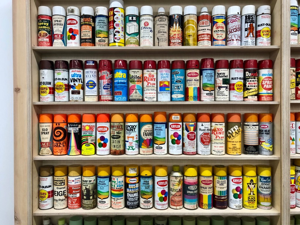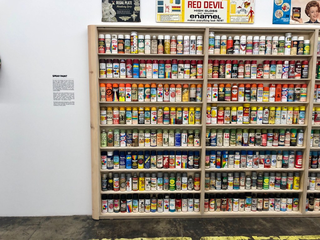 A massive collection of various brands and types of spray paint — tools of the trade for artists and creators, but especially graffiti writers of all kinds. On view at the Beyond the Streets exhibition in Los Angeles.