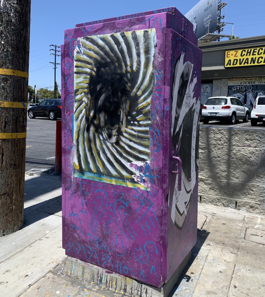 Yes, it’s true, folks! An illegal wheat-paste street artwork on a utility box in Venice Beach, Los Angeles has been defaced by a big black blotch of spray paint, ruining an artist’s creation. As Yoda might say: Shocked, we are.