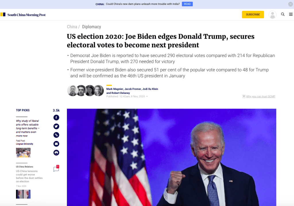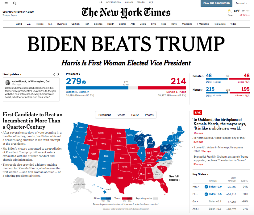We woke to the news this Saturday morning that the U.S. presidential election result finally has been called in favor of Joe Biden and Kamala Harris! It marks the end of an ugly, chaotic, incoherent, rhetorically-offensive and disturbing chapter in American executive political leadership (or lack thereof) and presidential history. America, congratulations for voting out Donald Trump! Congratulations to Joe Biden and Kamala Harris! The U.S. presidential election has riveted the attention of the world and been closely followed by media outlets around the globe. Posted here are some screengrabs of various major newspapers’ announcements from around the world.
