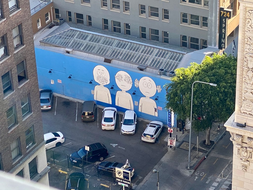 This wonderful mural in Downtown Los Angeles is a visual play on the age-old proverb “Speak no evil, See no evil, Hear no evil” that often accompanies an image of three “wise” monkeys. Here the evil is money. Instead of monkeys, the painting depicts three simple, cartoony line-drawing-style characters with cash over their eyes, mouths, and ears. You can find this mural along Spring Street just south of 7th Street.