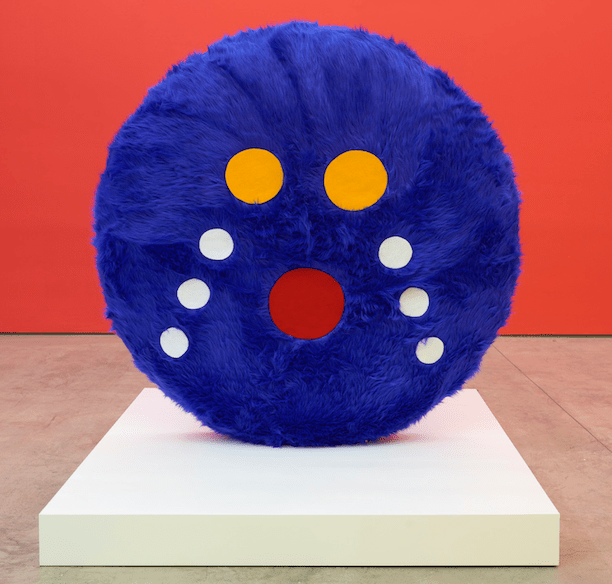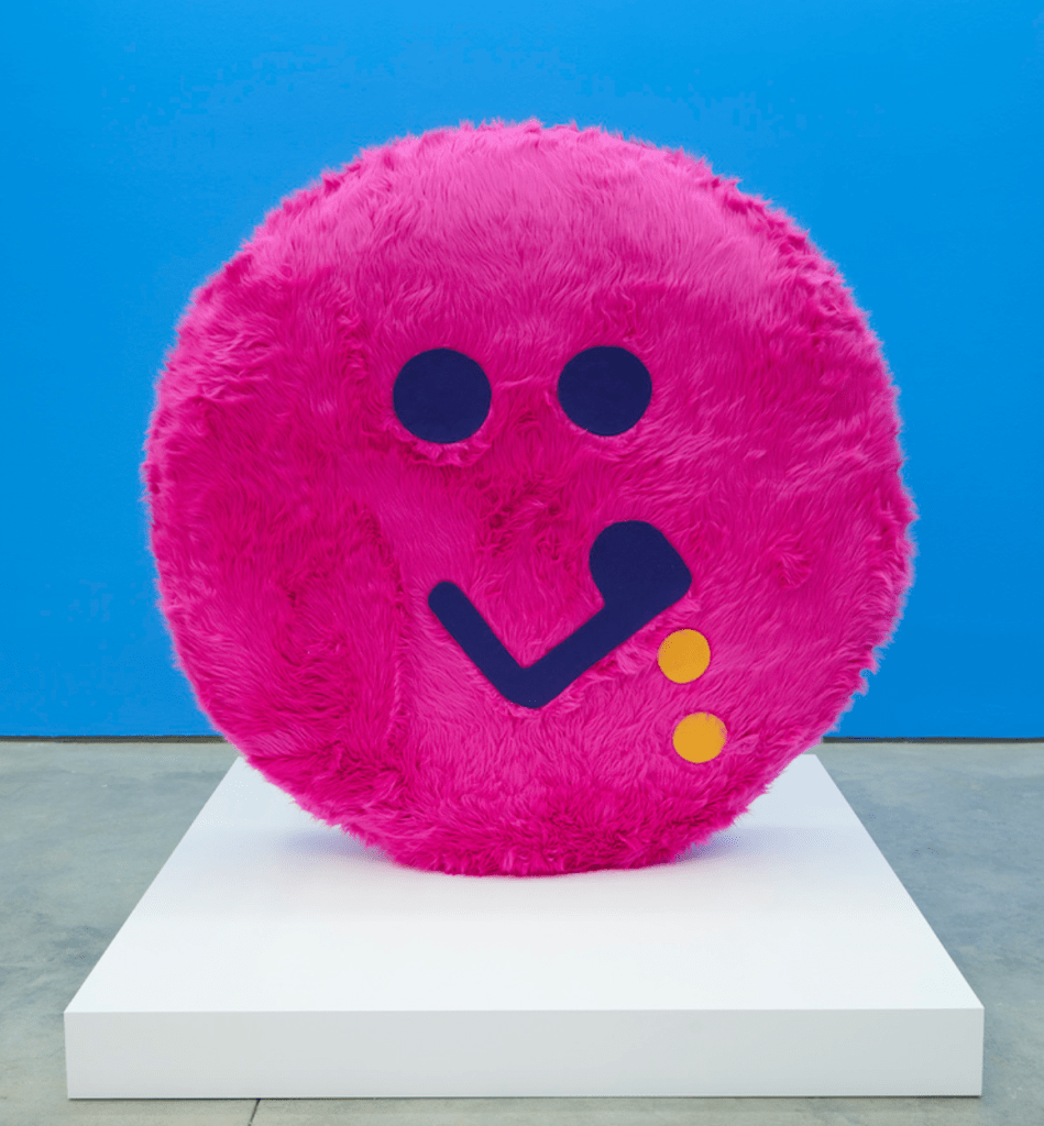 To be clear, Kawai’s art is, well, kawaii. Her current show is equal parts abstract paintings and sculptural objects. The entire shows embraces vivid, energetic colors. Her paintings have words written in Japanese in a school kid-like scrawl. Dotted throughout the gallery are larger than life fuzzy 3D emojis set upon plinths and daises. These are like a child’s plushies toys, soft and furry and richly color-saturated in deep blues, greens and fuchsias. They’re almost too full of candy-coated happiness, and, in this way, a bit unsettling, but otherwise utterly compelling. You immediately want to take one home with you and snuggle up with it while camped out on the sofa binge-watching the hot Netflix series du jour.