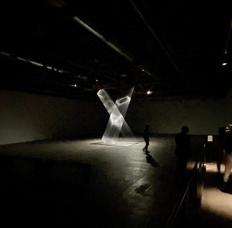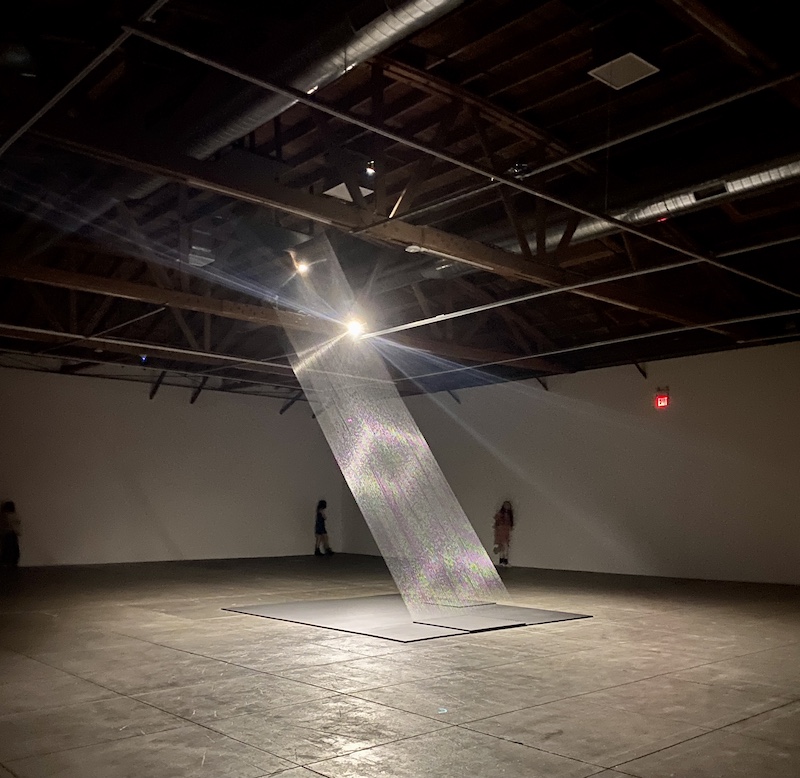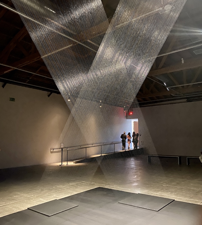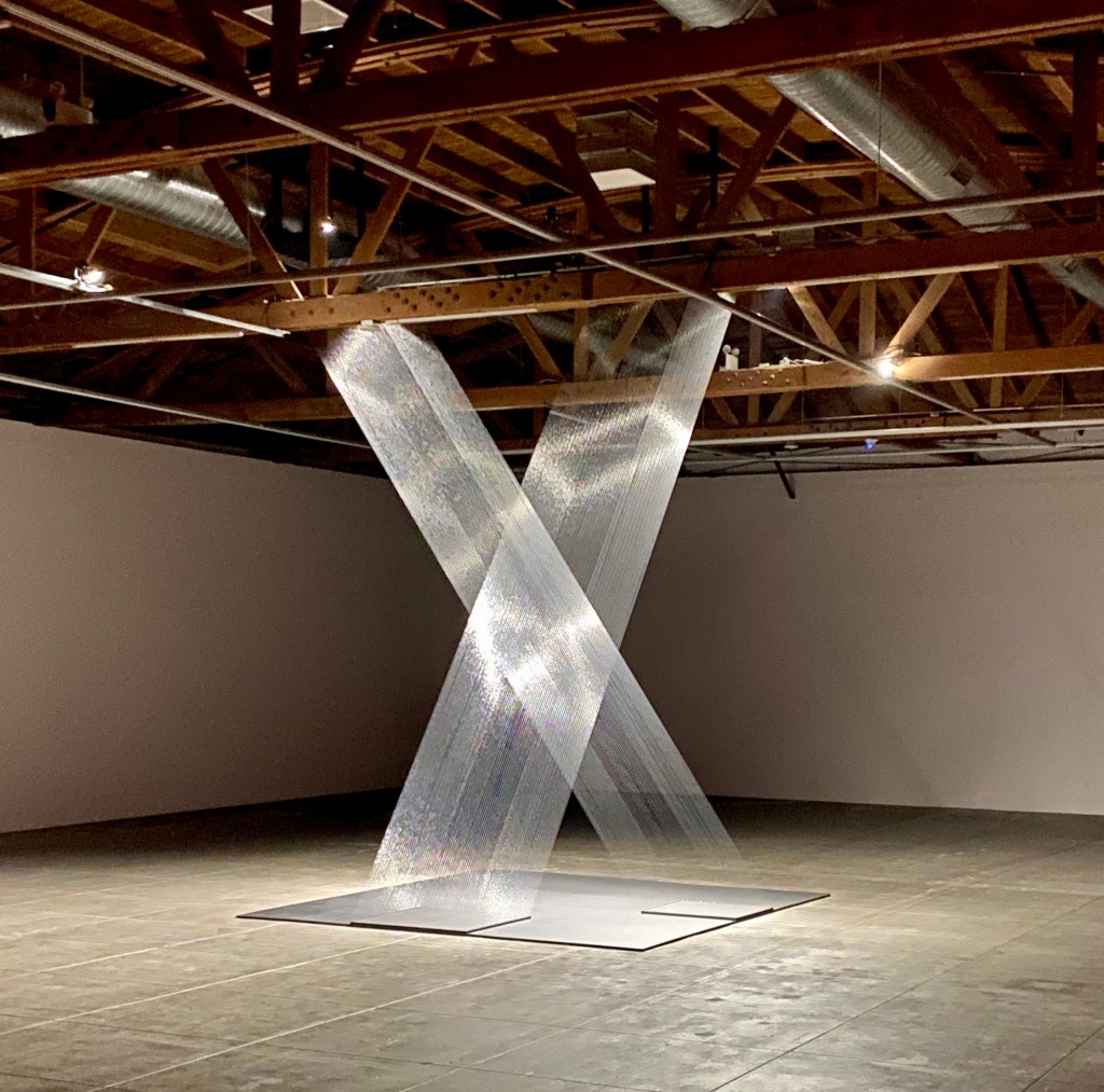 One work in particular blew our minds. It’s a pair of tilted, rhombus-like, geometrically intertwined columns comprised of hundreds of silver strings illuminated by lights in an otherwise massive dark space. Pape’s show fills two massive galleries, but one of these spaces is devoted to this singular artwork, titled “Tteia 1, C.” It is a masterwork.