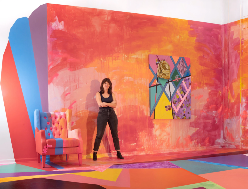 Cain’s paintings are bright, bold and epic abstract works that break the two-dimensional barrier of the canvas (or wall) and give zero f*cks! Often her artwork will use various pieces of furniture and other objects as part of the paintings. Sofas, benches, backpacks and chests of drawers are attached and or adjacent to the paintings as if they’re part of the canvas or serve as plinth-like supports of work.