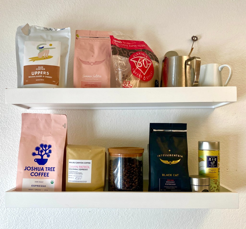 Here’s the coffee set-up at our headquarters. We put up these shelves above the counter where the coffee-making gear is stationed. Here we’ve got our choice of coffees and teas, plus some milk pitchers, a bag of Hario V60 pour-over filters, and a hand-held electric frother for milk and matcha. The coffees in this selection are whole-bean roasts from Joshua Tree Coffee, Malibu Canyon Coffee, Intelligentsia, and Sur Coffee. If you’re seriously addicted and obsessed with coffee like us, then you want to keep your beans and brewing tools within an arms reach of your espresso and coffee machines.
