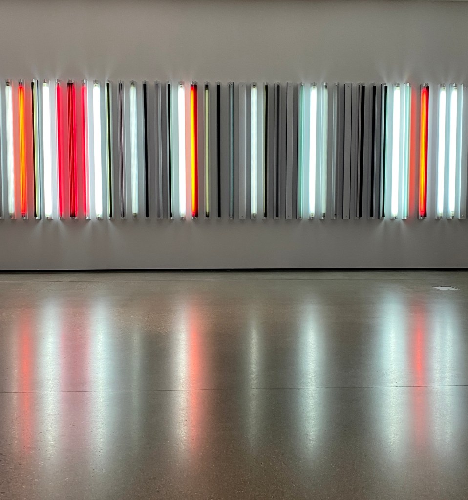 Artist Robert Irwin’s wall of multi-colored fluorescent tube lights at the Los Angeles County Museum of Art serves as post-modernist tribute to a specific L.A. neighborhood for which it’s titled. “Miracle Mile” is an artwork we posted about before. It’s a work that we’ve seen in person, up close, too many times to remember. We never tire of it; It never get old. Viewing it is meditative and feels like a balm on our psyche.