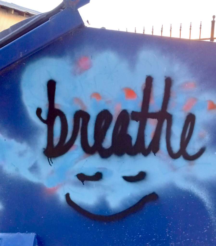 Here’s an important message we should all heed: “Breathe.” A lovable and small graffiti artwork on the side of a dumpster in Houston’s Montrose neighborhood reminds us of this healthy little exercise, something that can help us remain calm in moments of stress and emotional upheaval. Tip of the hat goes to Houston-based artist Ray Dunlap ( @dunlapian ) who snapped this pic and whose contemporary abstract-expressionist painting we’ve previously posted about . Thanks, Ray!