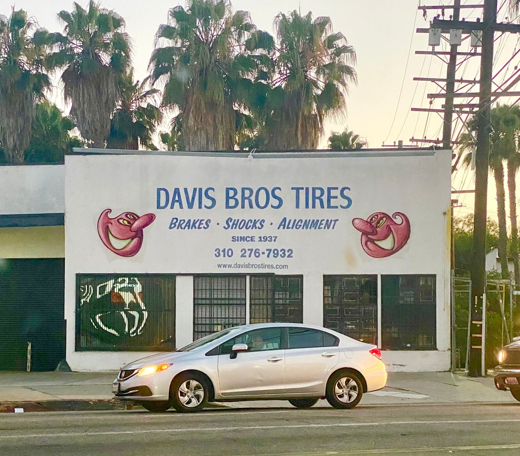 The location of the artwork pictured here on this tire store is not an accident. Culver City is a part of L.A. that has for much of Hollywood’s history has been the home to many film production studios and entertainment companies. In the recent years more and more interactive technology and media companies and small production firm have made the neighborhood home and along with these there’s been an explosion in the number major and small art galleries. Blume and Poe, for example, has a massive art space in Culver. The tire store is across the street from a number of galleries, including Hashimoto Contemporary, smack in the middle of this newer epicenter of L.A.’s art world.