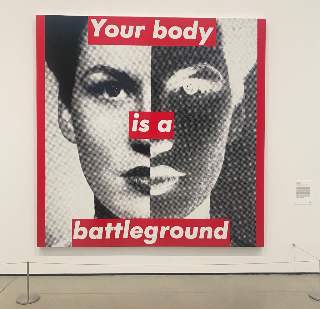 Kruger’s “Untitled” painting, otherwise known as “Your Body is a Battleground,” was a potent, powerful and important statement in the 1980’s when it was created. More so now in 2022, when for the first time in decades the critically important right for a women to choose to have a safe abortion is under threat in America.