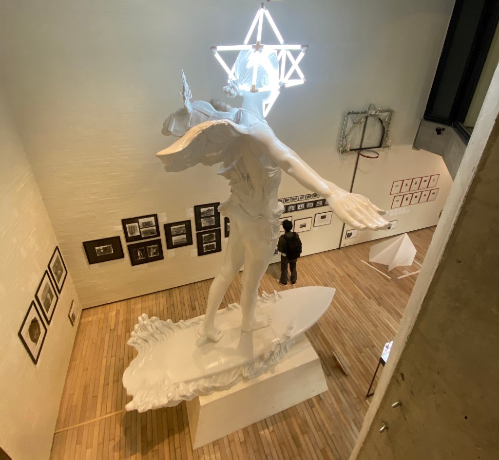 The “Surf Angel” is a collision of forms. Her figure is like a Greek figure rescued from antiquity in modern times, all white, devoid of it’s color, but augmented by an abstract geometric array of white neon (or are these fluorescent) lights filling the void where her face and most of her head should be. At certain angles giving the effect of a halo. The scale is monumental. The image is indelible and rapturous.