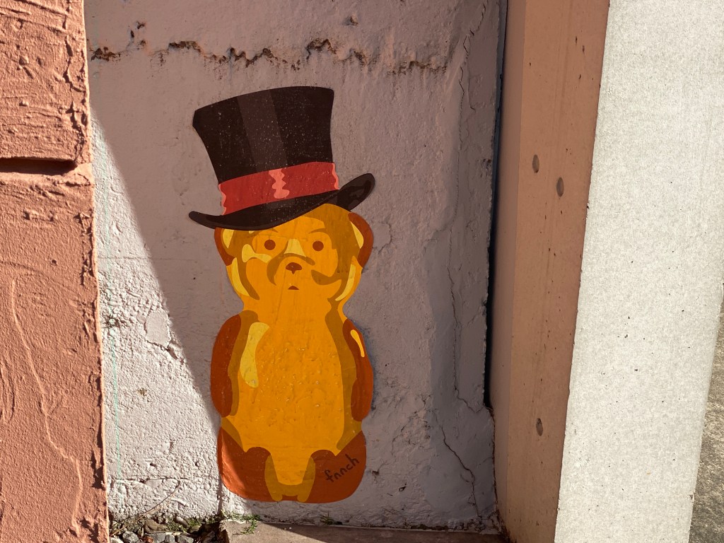 We spotted one of his famous honey bear wheat-paste artworks while walking down “Cat Street,” that narrow, pleasantly relaxed half mile-long lane of trendy shopping that connects the high-end Omotesando neighborhood with the hyper-bustling Shibuya. This honey bear was near the Shibuya end, where the street-level energy pumps up a few notches. This one depicted the honey bear wearing a top hat.