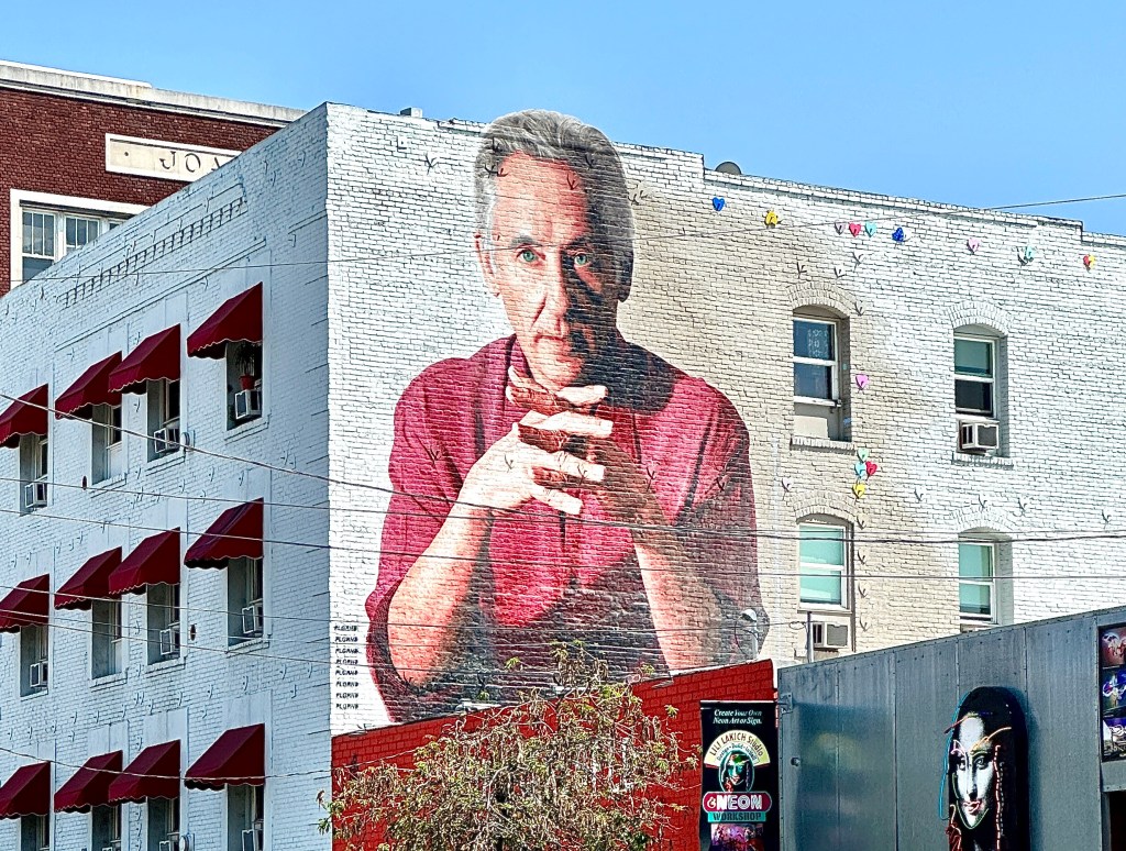 In the Arts District of Downtown Los Angeles, there’s a massive mural of a middle-aged man, his hands clasped together, staring down at the street below from an old tenement-style building (old by L.A. standards, anyway).