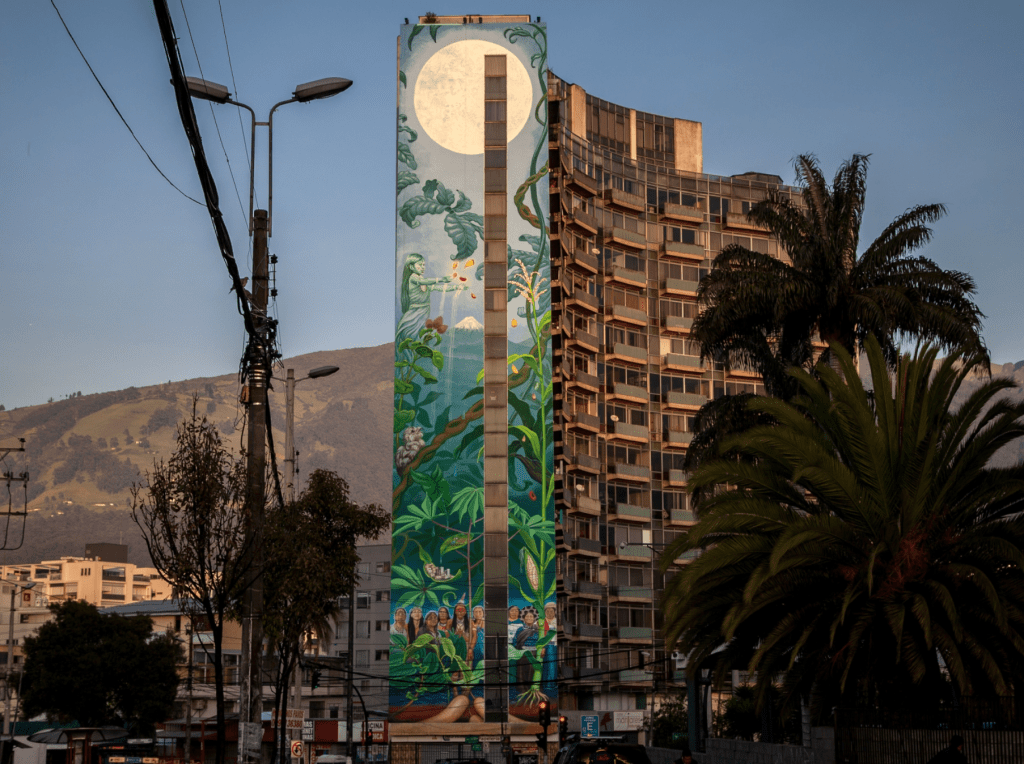Many of her artworks are vertically aligned apartment blocks in Europe, Asia, Latin America and the U.S. The image above is on a tower block in Quito, Ecuador.