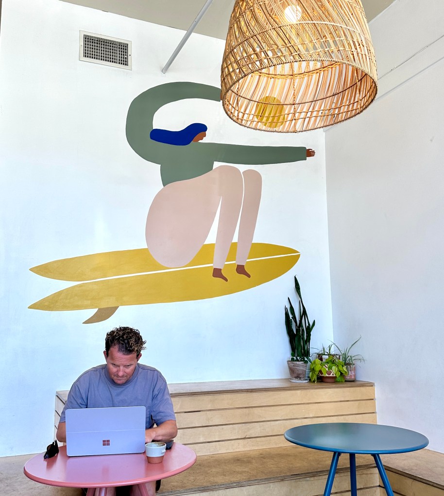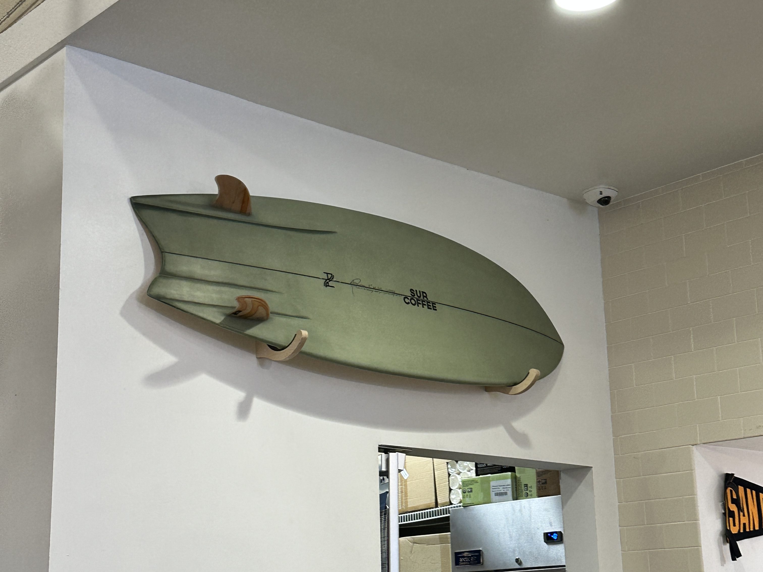 San Clemente is near several famous world-class surf spots and as such is a surfing mecca. The cafe’s decor reflects this with the somewhat cliched surfboard mounted on the wall as art and a beautifully conceived and painted mural of a surfer.