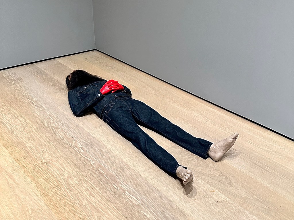 They lie with their eyes shut and hands clasped across their bellies, as if napping. On closer inspection the vibe is less like they’re asleep and more like they’re lying in state at a funeral memorial service. At first glance, viewers may think these are real people, actor-models, or the artist himself, staging a performance, but these are convincing mannequins as sculptural objects in an art installation (thankfully) plainly titled “Heads, Hands, and Feet.”