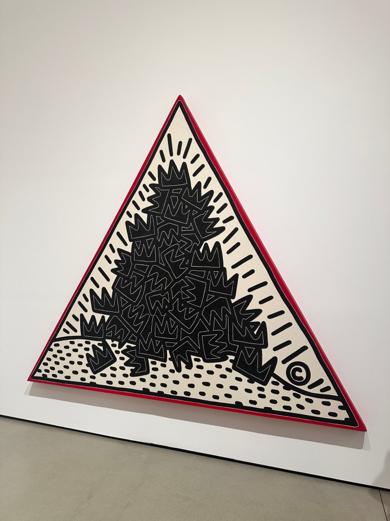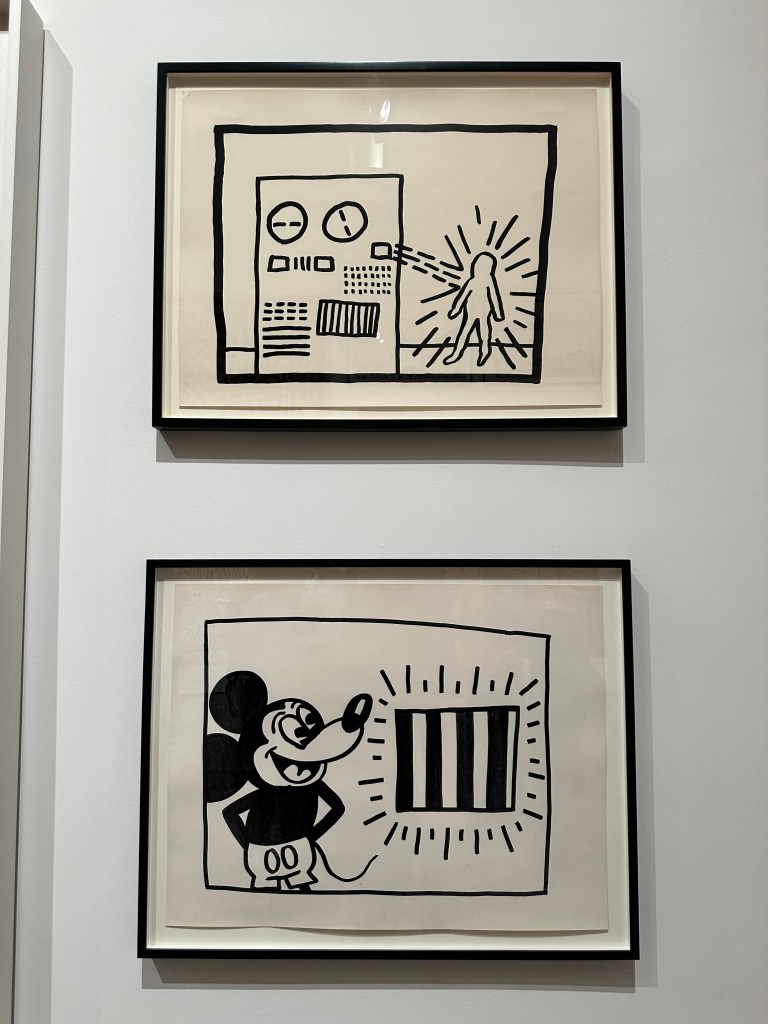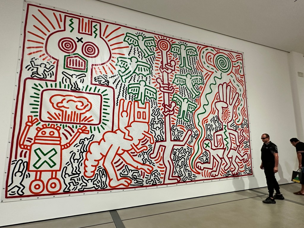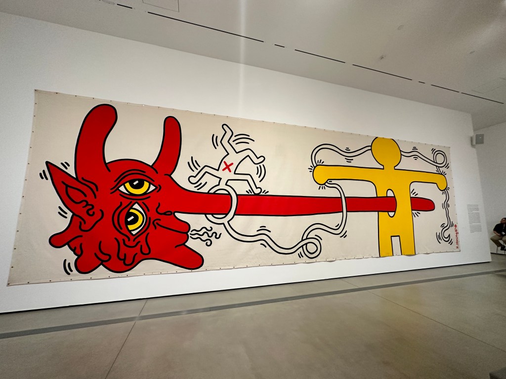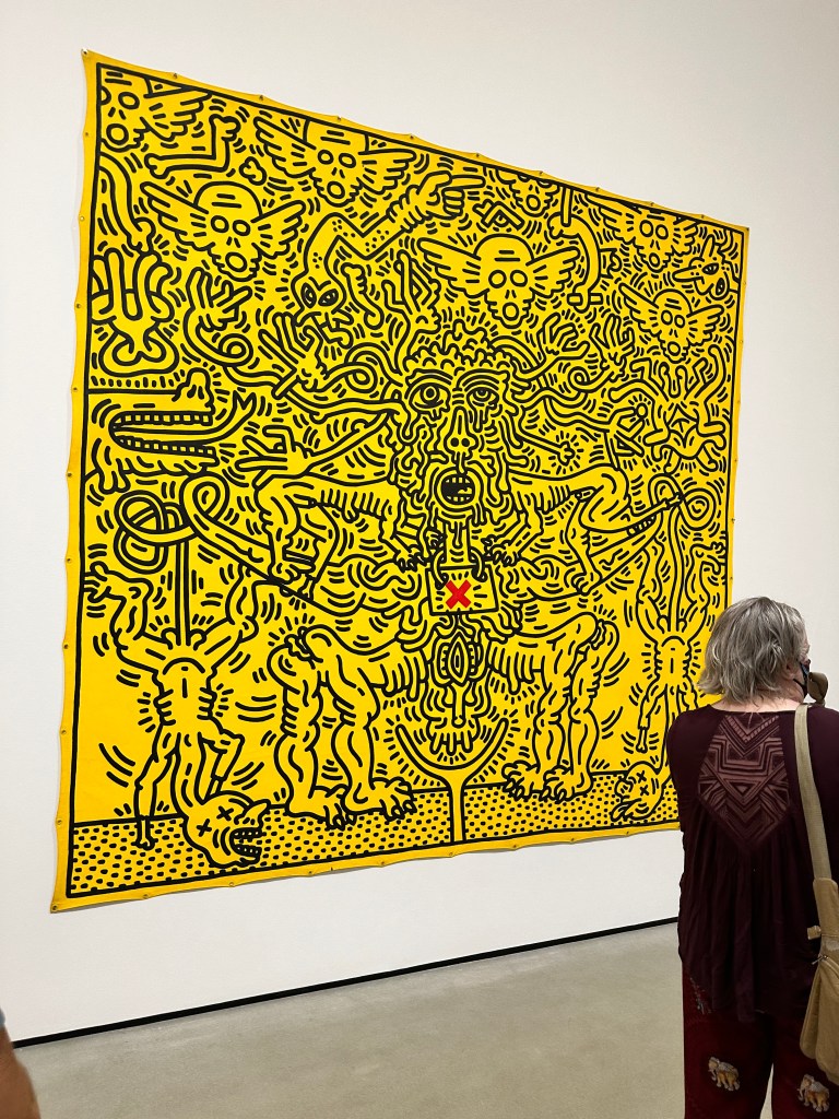 On the afternoon we visited, the Broad was packed. The show has Haring’s most famous and iconic paintings, mostly on tarp, as well as archival materials, collaborations and sculptural objects, and posters.