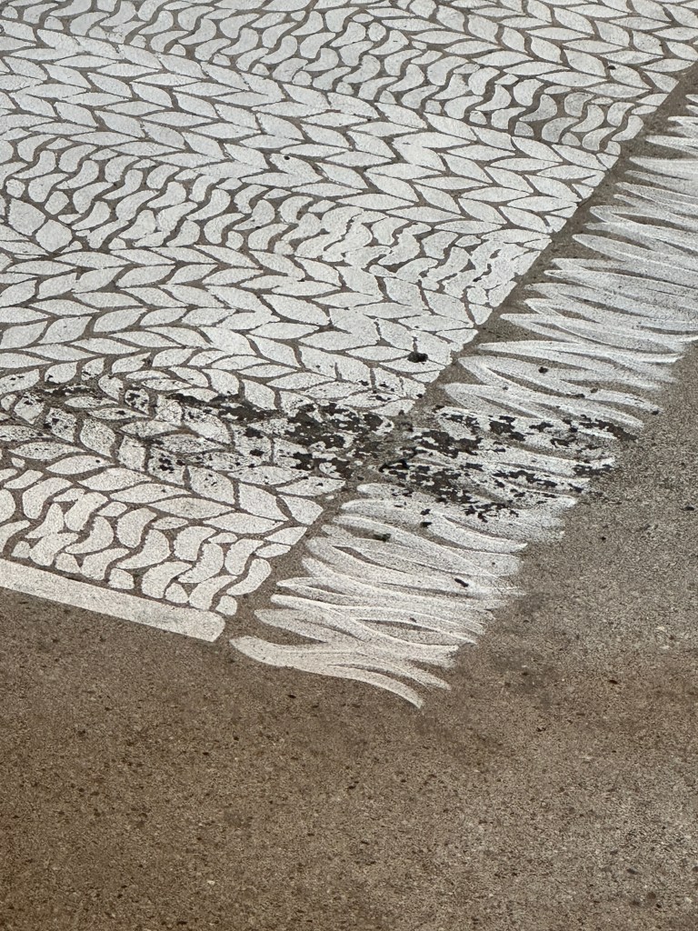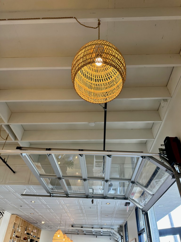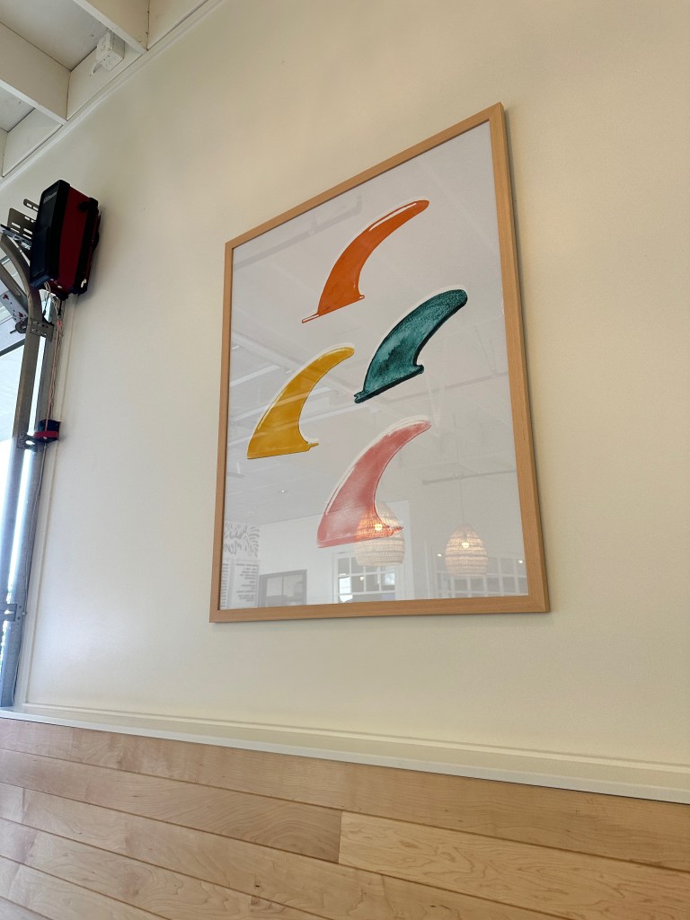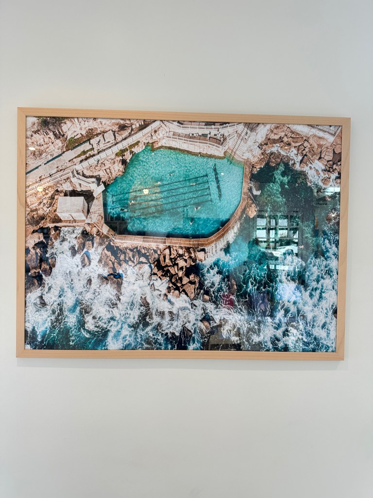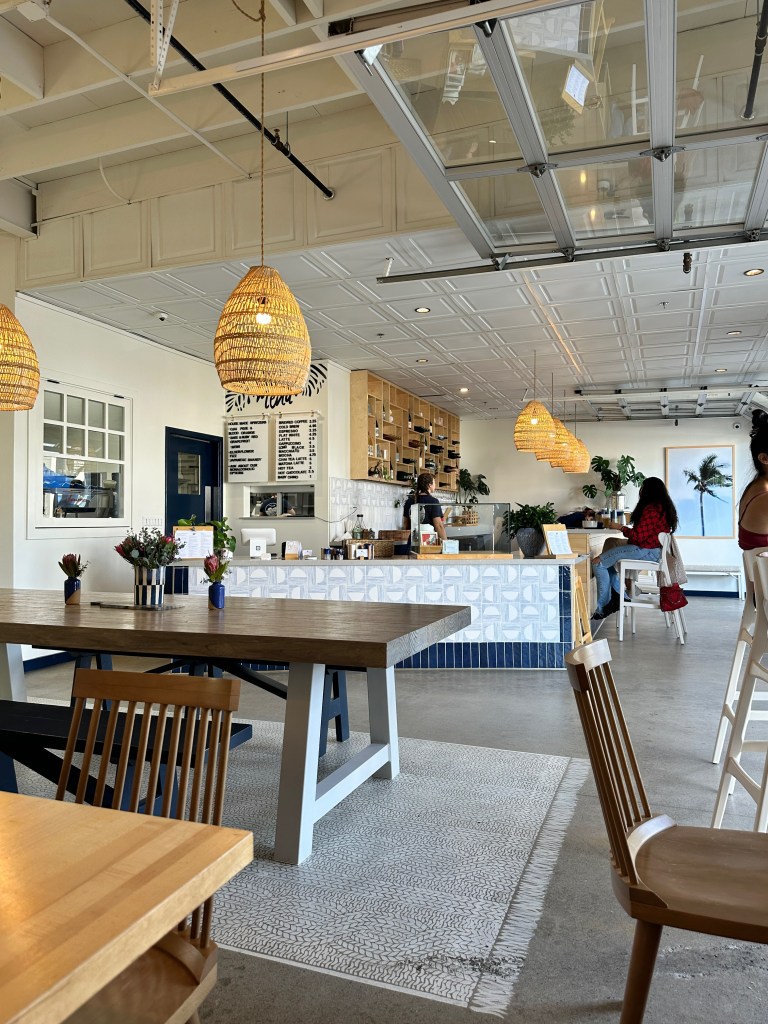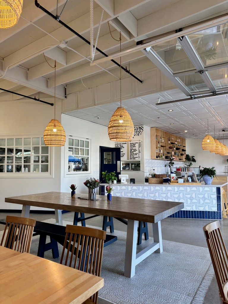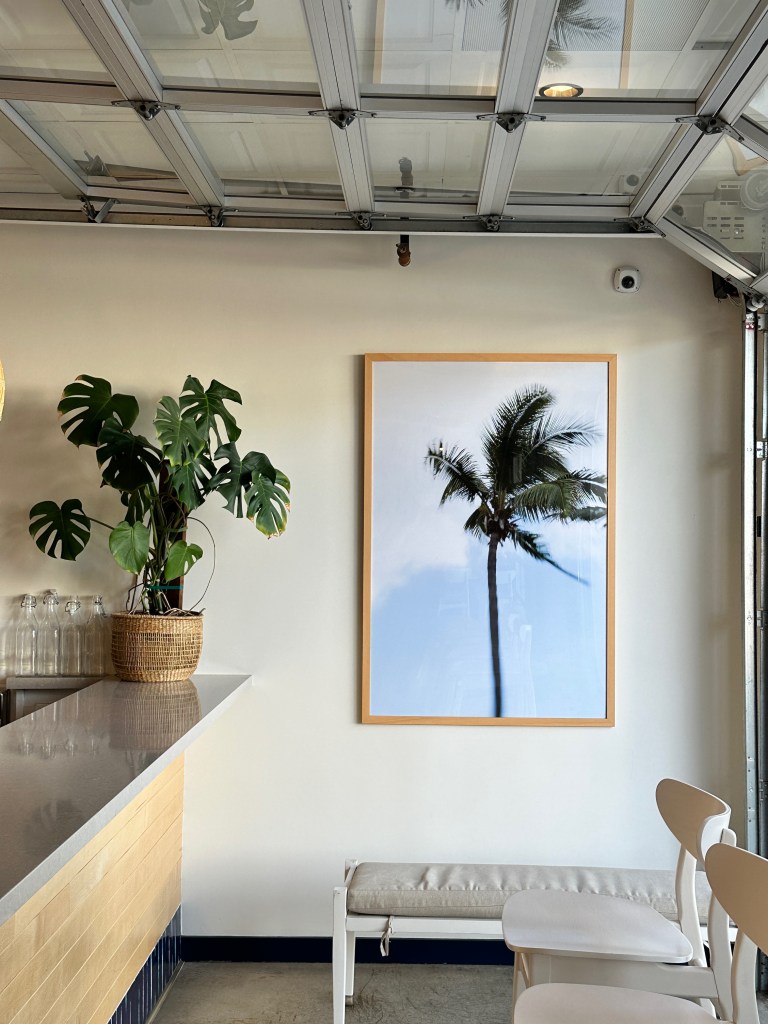 The atmosphere and decor are aesthetically spot on with that beachy, Aussie vibe. The cafe fills a space that feels like a former garage. Beautifully framed large-format photography lines the walls. References to surf culture are infused in the space. In the middle of the dining area is a massive communal table over what appears to be a white area rug, which upon closer inspection is not an actual rug but a painting of one on the sealed concrete floor. Fig plants accent the space and a monochromatic mural of black leaves is painted the breadth of a long wall.