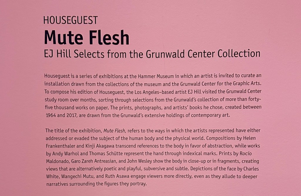 In the latest “Houseguest” series installment at the Grunwald Center for the Graphic Arts at the Hammer Museum in Los Angeles, artist EJ Hill steps into the role of guest curator with “Mute Flesh.” The exhibition dives into the complexities of corporeal existence, exploring how the body leaves traces and transcends through various states of being.