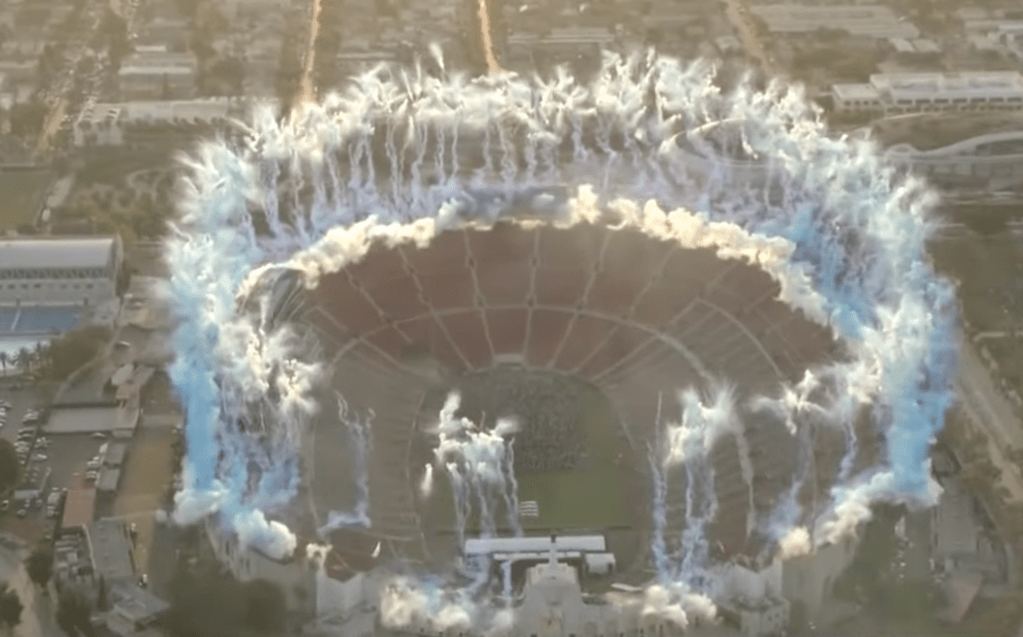 This storytelling set the stage for a series of drone-delivered daytime fireworks and bamboo-fueled explosions, painting the sky in hues of orange, red, and blue. The pyrotechnics softened momentarily to form delicate images of flowers—his “Birds of Paradise”—as a gift to the city of Los Angeles.