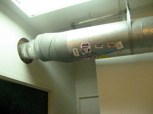 Miami street art: Wider shot of some stencily stickers and tags on an air duct in the back of the … More